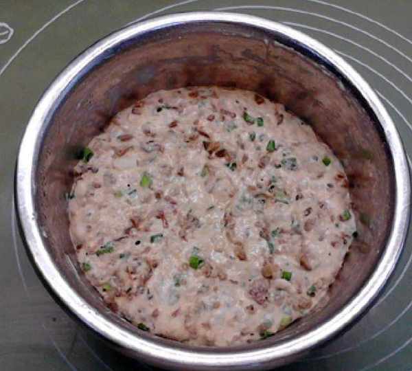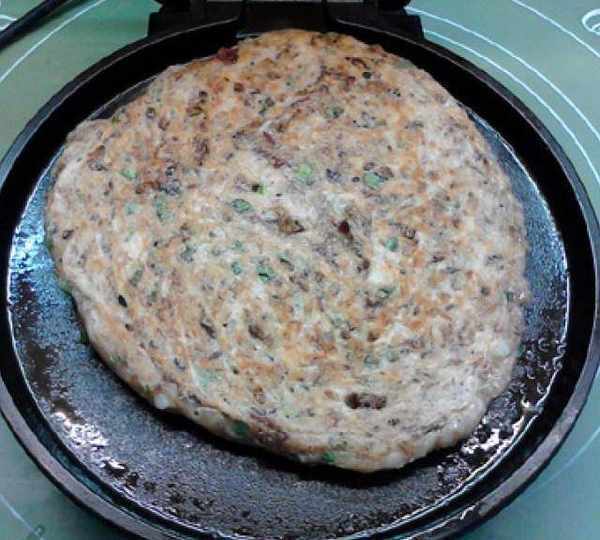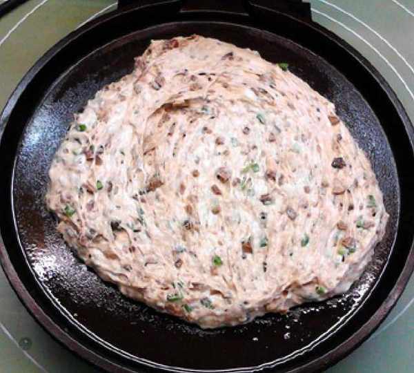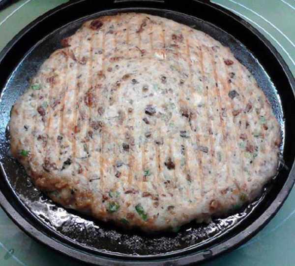 醬香臘肉蘑菇餡隻做瞭一個夏巴塔就被封凍,而今得閑,把它解封來做個帶蔥香味的軟餅,盡可能多的在面糊裡加餡料,隻為消耗這餡,而餡料一多,面糊也不用額外去調味,烙出的餅看起來麻成一片,吃著還挺香。