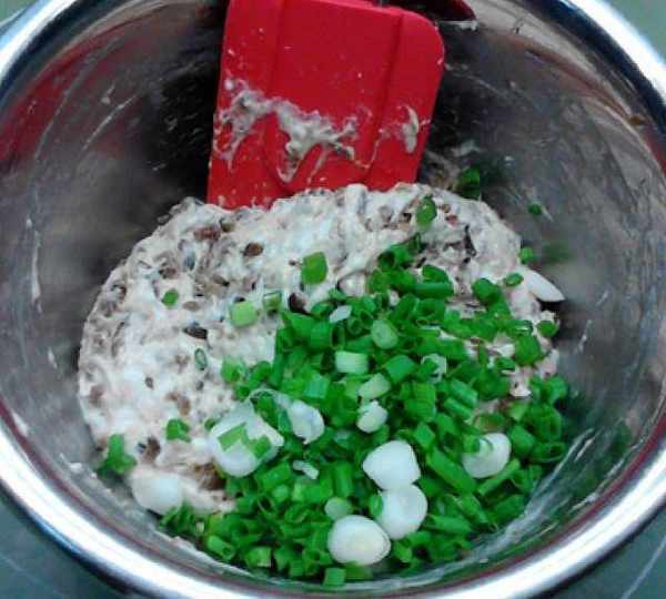 第1步、用料:醬香臘肉蘑菇餡80克,面粉100克,水100克,鮮酵母3克,蔥20克。