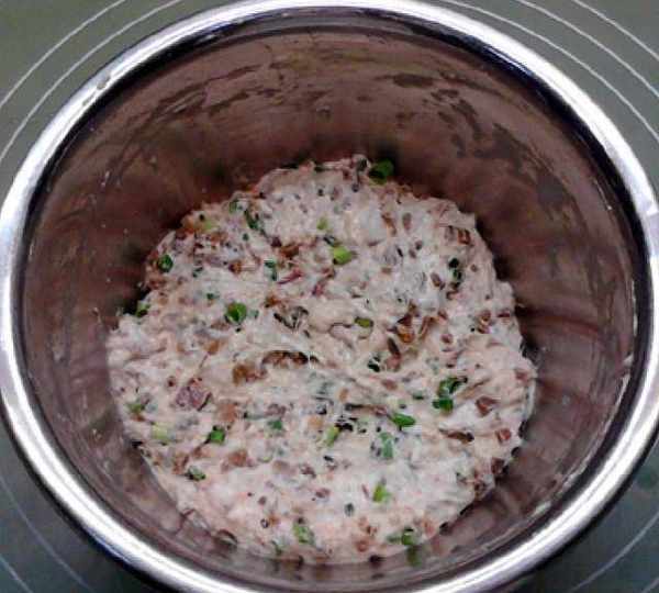 原料:醬香臘肉蘑菇餡、面粉、水、鮮酵母、蔥。