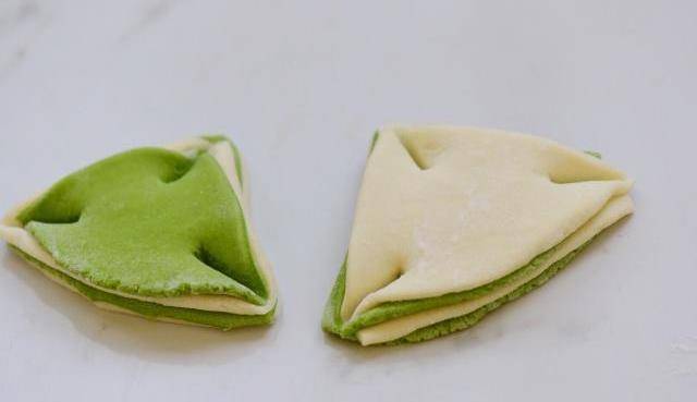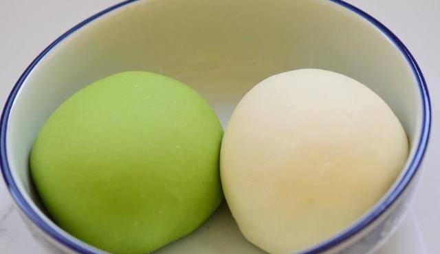 1、把面粉分成2份,一份200g,先取200g面粉、冷水100g、酵母2g混合,和成原味的面團備用。另一份200g面粉、菠菜汁100g、酵母2g混合,和成綠色的面團備用。