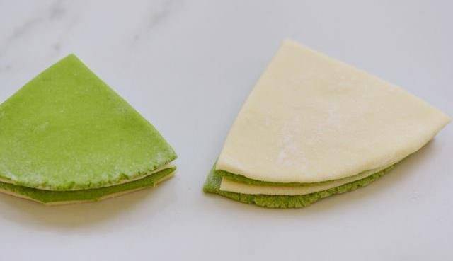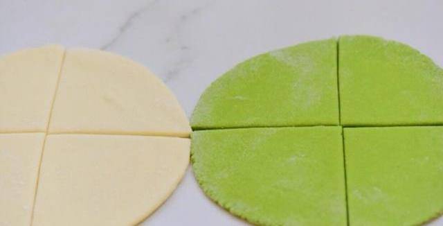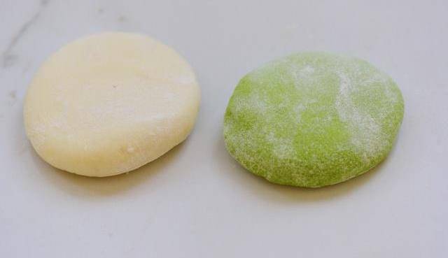 2、原味的和綠色面團再各分成8個劑子。分別再取一個原味的和綠色的按扁。