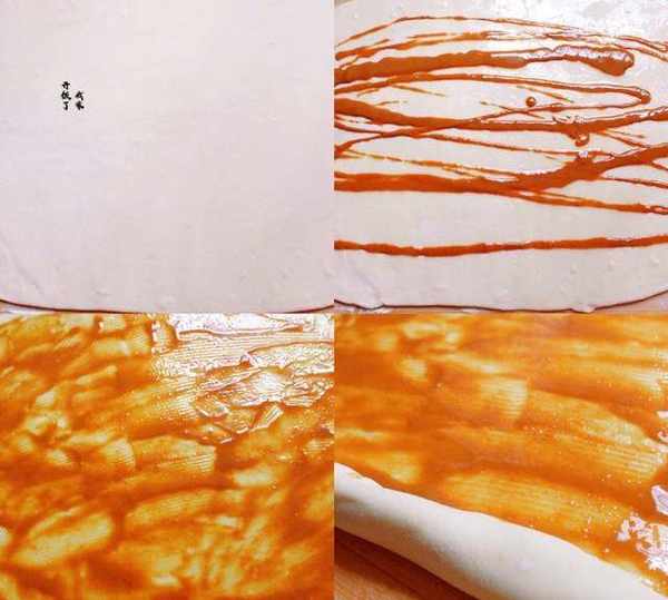 4.松弛好的面團搟成長方形,厚度為一元硬幣,淋上芝麻醬,接著用刮刀或鏟子將芝麻醬塗抹均勻,最後把面皮卷起來。