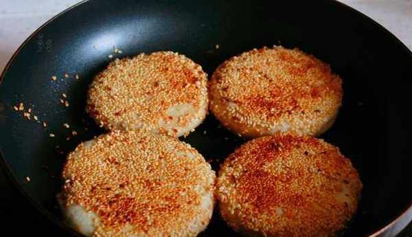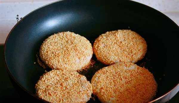 11.小火慢煎,先將有白芝麻的一面朝上。
