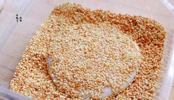 10.在面餅表面刷上一層清水,蘸上白芝麻,再放入平底鍋中。
