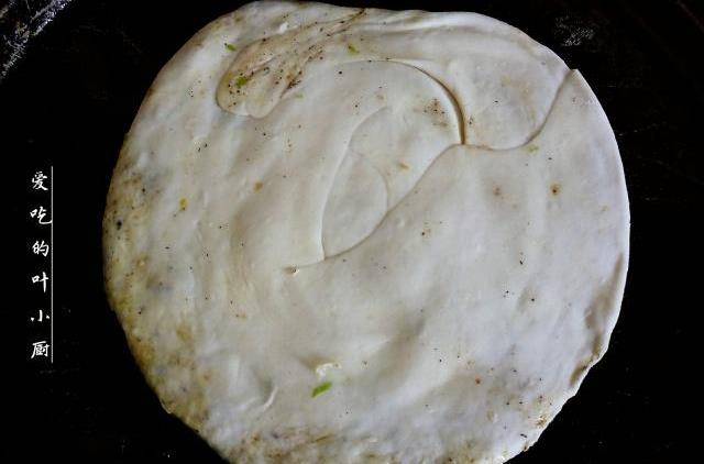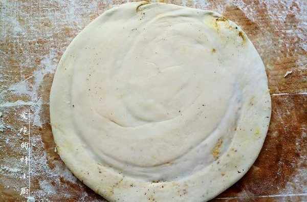 2.做油餅用死面即可,不需要發酵,所以直接往面粉裡加入適量的清水揉成面團,揉成面團後揪出一小團,用搟面杖把小面團搟成一張薄薄的圓餅,然後把料汁均勻的塗在圓餅上。