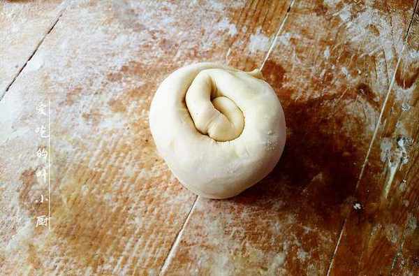 4.圓餅卷好後,再用手掌把它按扁,按成一個小圓餅,然後再用搟面杖把它搟薄,搟的大一些,搟的時候註意不要用太大力氣,不然油會被擠壓出來。