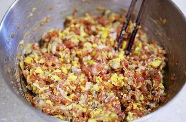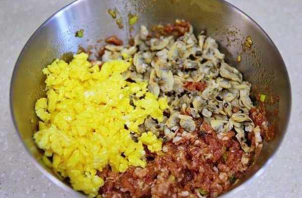 雞蛋加一點鹽打散,小火炒散,邊炒邊攪拌讓雞蛋變成很碎的雞蛋碎在醃好的肉餡裡加入處理好的蛤蜊肉、雞蛋碎