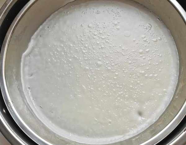 將鑼鑼刷油,倒入一勺半米漿,鍋中水沸後放入鑼鑼,在熱水中先左右晃動,然後蓋上鍋蓋。