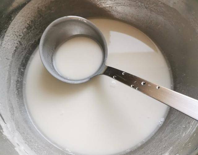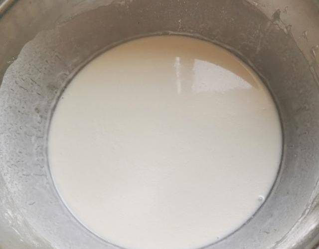 再將滾燙的150克熱水倒入米漿攪勻。