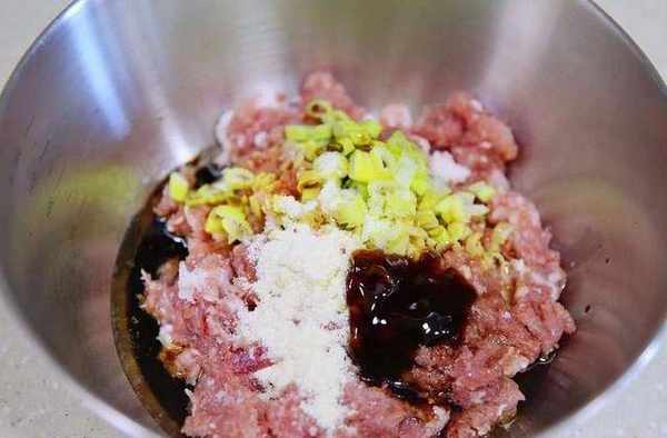 豬肉去皮剁成肉餡兒,加入所有調料拌勻醃制20-30分鐘