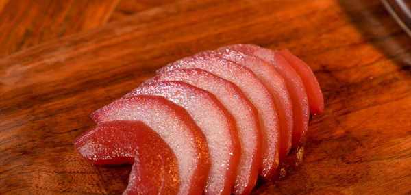 5:然後把雪梨拿出來,放在案板上,用菜刀切成薄片,厚度大概2毫米。
