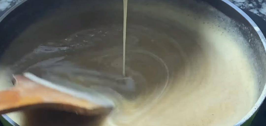 8:燒開後轉為小火,倒入調好的淀粉水,一邊攪拌一邊倒,全程開小火熬煮。