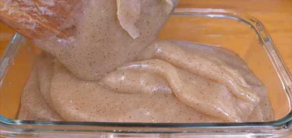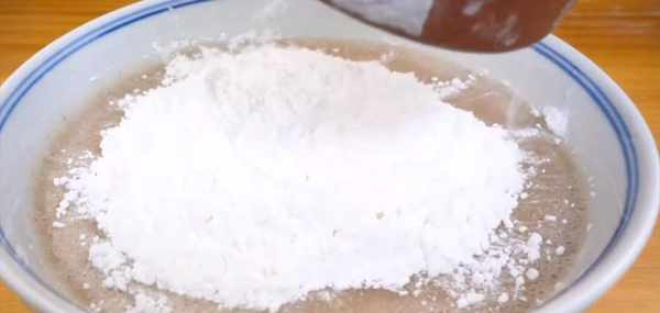 6:其中一份果汁,倒入大碗中,再加入80克豌豆淀粉,把它攪拌均勻。