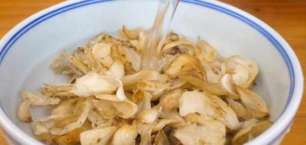 2:準備適量的百合幹,加入食鹽、白醋,再倒入開水,浸泡30分鐘。