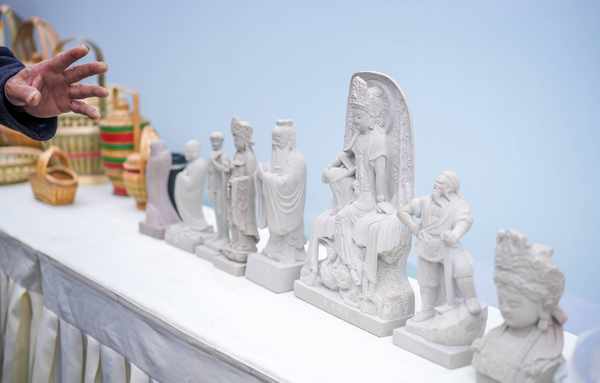 當她介紹到重慶市級非物質文化遺產——玉溪石刻的時候,她邀請石刻的傳承人莫志鴻親自來為大傢介紹玉溪石刻,莫志鴻說,潼南與石足、安嶽相鄰,玉溪石刻與國傢級非遺的大足石雕與安嶽石刻一脈相承,已有上千年的歷史,他自幼受到父親的熏陶,與石頭結緣,從此走上瞭石刻之路,是潼南玉溪石刻的第五代傳承人,擅長雕刻各類人物、動物造像。