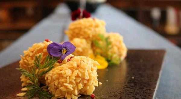 將蛋黃醬、青芥辣、煉乳混合,炸好的蝦仁裹上混合醬料,再裹上揉碎的薯片裝盤,用適量的花草點綴上桌。