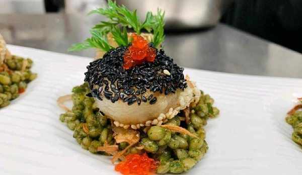 雙面沾上黑白芝麻小火慢煎,把青麥仁用香草醬炒香,加入雞粉等調料調味後出鍋。