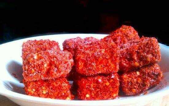 4、這時候我們將發酵好的豆腐塊在我們準備好的調料裡滾一下,這樣可以讓豆腐均勻的裹滿調料