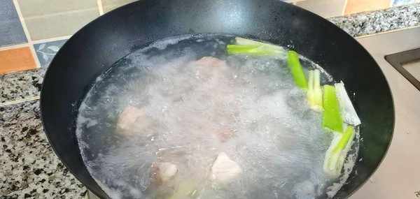 2,洗凈的排骨放入鍋中,加適量清水、蔥段、薑片,焯水5分鐘。