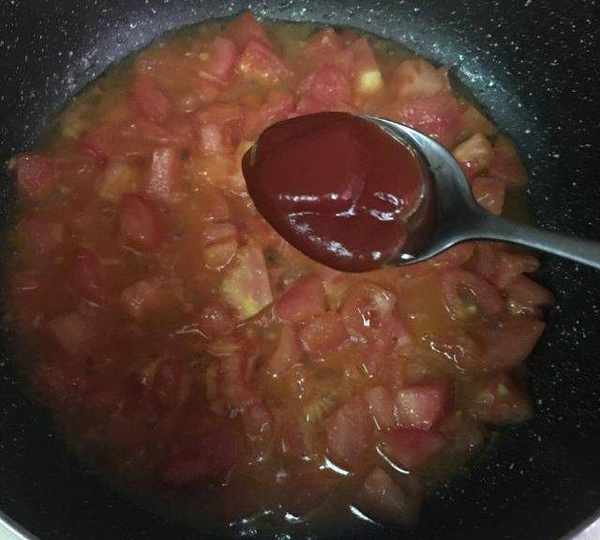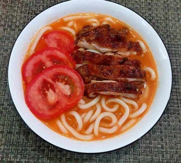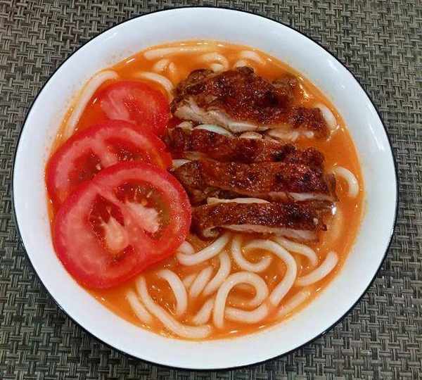 原料:黑椒雞腿肉、番茄、烏冬面、鹽、生抽、番茄醬、雞精。