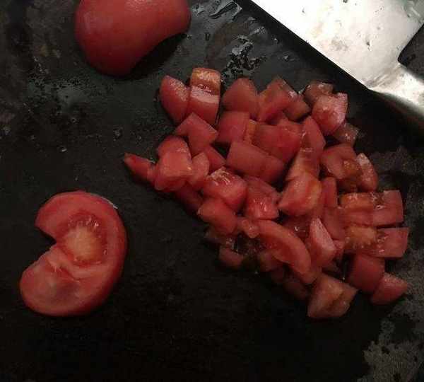第2步、番茄去皮切小丁,再切幾片番茄切片備用。