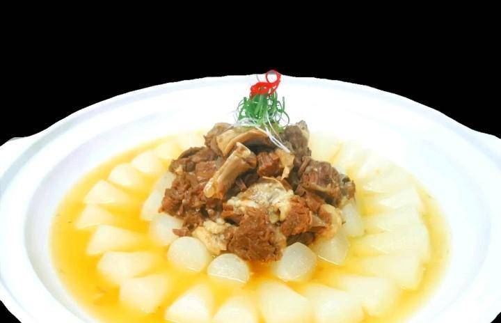 冷卻後的牛肉裝盤,灌入過濾後的湯汁和蒸熟的蘿卜即可
