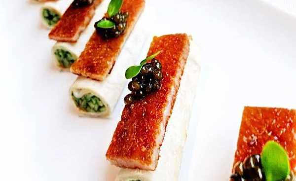 將炸好的松板肉疊加在卷好的面皮上,放上少許的魚子醬,點綴香椿苗即可