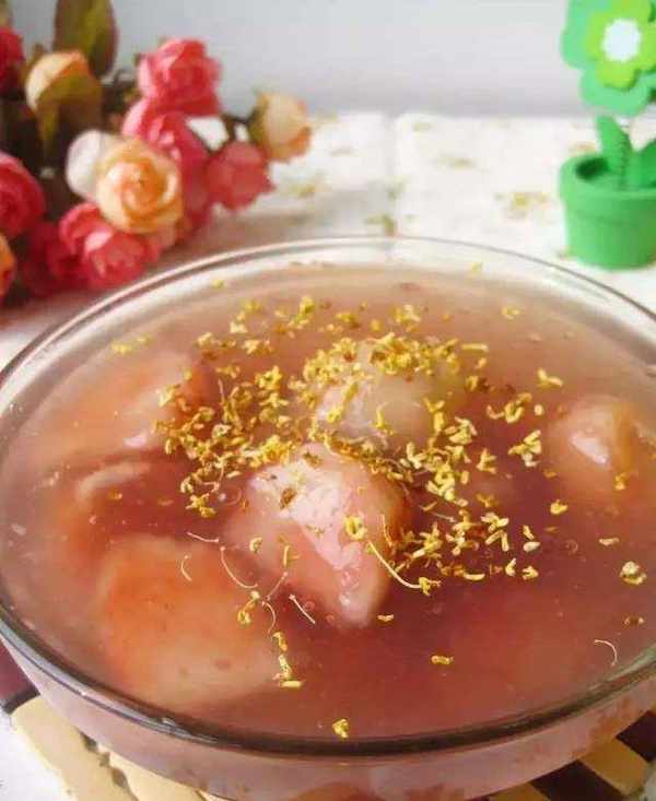 光潔的芋苗口感潤滑爽口、香甜酥軟,湯汁呈醬紅色鮮亮誘人,散發著濃鬱的桂花香,吃後唇齒留香。選用新鮮芋苗,蒸熟後剝皮;加上特制的桂花糖漿,放在大鍋裡慢慢熬制。煮的時候要放一點口堿,這樣芋苗煮才會煮出紅彤彤、誘人的顏色。