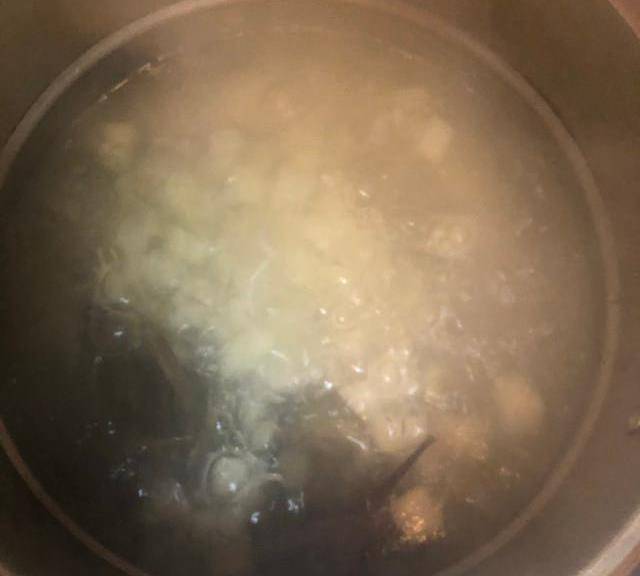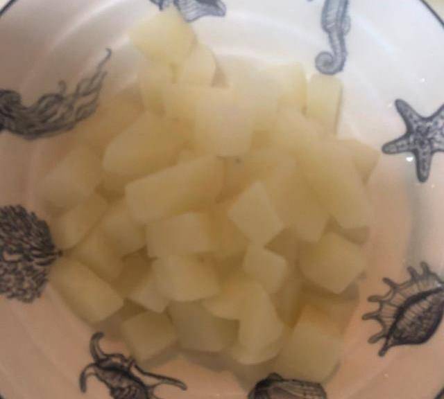 第2步、水開3分鐘左右撈出。土豆去生瞭,又保留脆感。我的被我焯時間長瞭。已經熟透變面瞭。孩子鬧。