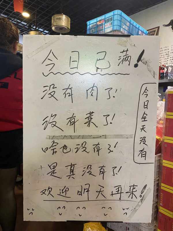 店裡一張招牌可能隨時準備掛出,上面寫著“今日已滿!沒有肉瞭!沒有菜瞭!啥也沒有瞭!是真沒有瞭!歡迎明日再來!”楊本新累到去醫院掛水,員工也集體累趴。店門口曾經在4月18日掛出“因員工超負荷工作,停業休整三天”的牌子,結果隻停瞭1天,就因為外地食客打“12345”催促開門,生無可戀地恢復營業。普遍的傳說是,當地政府部門還派出工作人員進駐牧羊村,幫忙串肉。