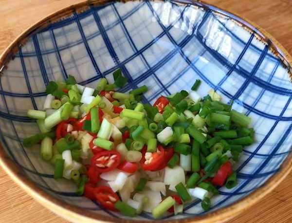接下來,準備幾粒大蒜拍扁後切成蒜末。幾片生薑切成薑末。切好和大蒜放在一起,幾個小米辣,切成辣椒圈,幾根小蔥切成蔥花備用。