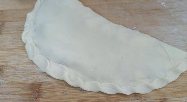 接下來,把醒好的面團放在案板上揉搓排氣,然後搓成長條,再切成均等的小劑子。把每個劑子壓扁後,搟成大薄片,放入調好的韭菜雞蛋餡。然後對折過來,用手壓一下邊緣防止露餡,樣一個生坯就做好瞭。