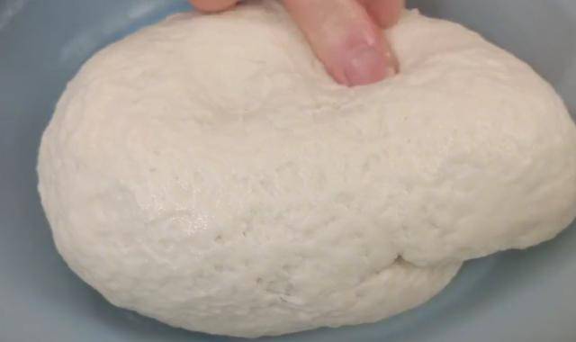 碗中準備200克普通面粉,一半用150度開水和面,另一半用冷水和面,攪成絮狀之後,混合到一起揉成面團。然後蓋上蓋子,放一邊松弛40分鐘。