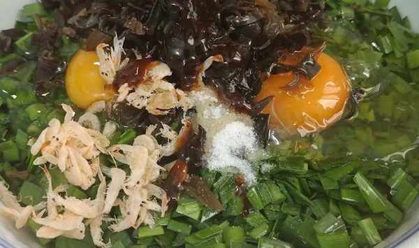 把韭菜裡面加入適量的食用油,攪拌均勻,使韭菜表面形成一層油膜。然後打入三個雞蛋,一把黑木耳碎,蝦皮,食用鹽,蠔油,小墨香油,攪拌均勻備用。