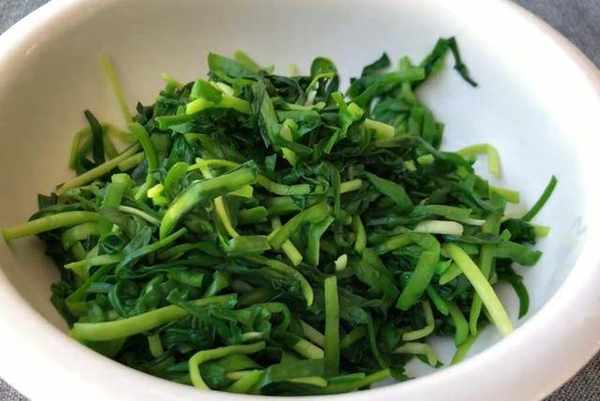 接下來,在鍋中加適量的清水,一勺食鹽,幾滴食用油,把切好的韭菜倒進來,焯水20秒左右,去除草酸,焯好水的韭菜控水撈出過涼水,然後擠幹水分,把韭菜放在大碗中。