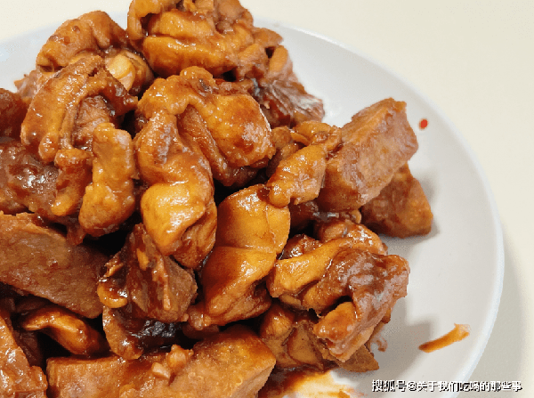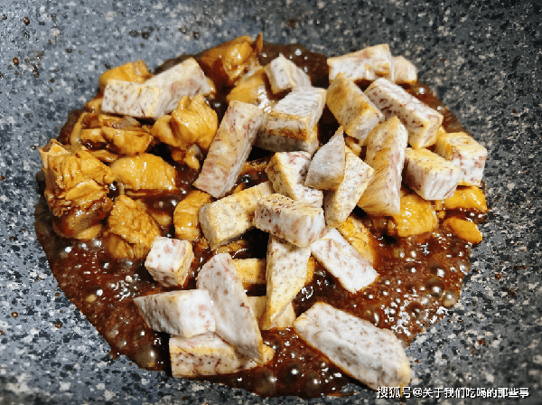 3、加入生抽、老抽、蠔油翻炒均勻,倒入芋頭塊炒一會兒,加開水沒過食材,煮開後小火燉20分鐘,加入適量食鹽、白糖調味,大火收汁後即可出鍋。