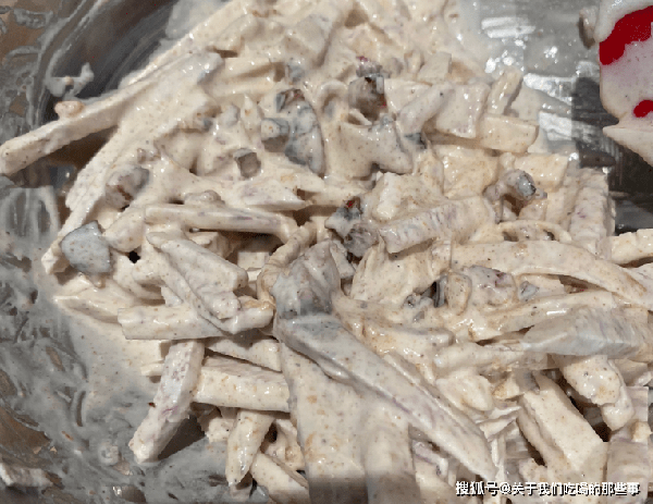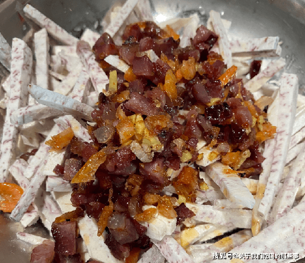 2、把炒好的臘腸、蝦皮倒入芋頭絲裡,加入食鹽、雞精、胡椒粉、五香粉,用手翻拌均勻,倒入大米粉糊再次攪拌均勻。