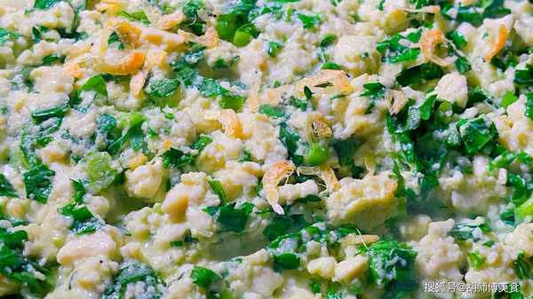 【原材料準備】:茼蒿300克、老豆腐一塊、雞蛋1個、食鹽、蒜蓉醬、雞精、生抽、食用油適量。