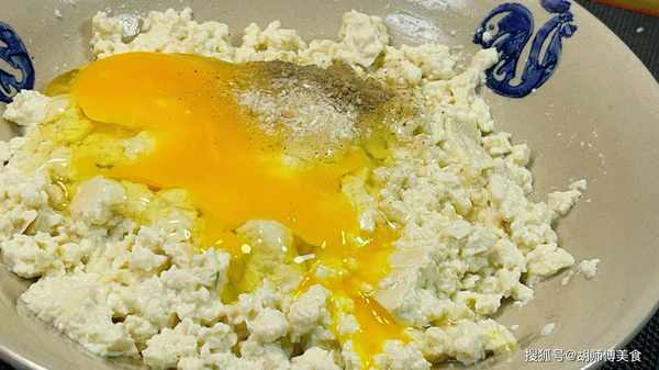 第三步:將老豆腐清洗幹凈後捏碎,然後把雞蛋放入到老豆腐中攪拌均勻,喜歡吃雞蛋的,可以放2個。