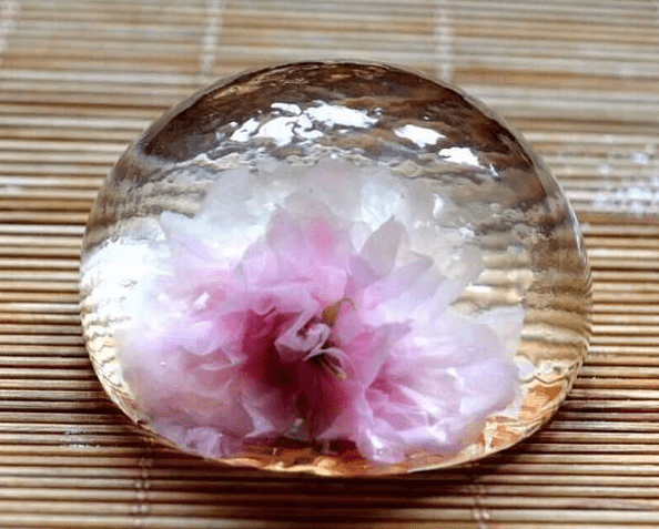 信玄餅是日本的一種傳統小吃,是用糯米粉做成軟年糕後沾上黃豆粉吃的。一傢日本點心店用瓊脂代替糯米粉,從而制作出瞭像水晶球一樣透明的“水信玄餅”。聽聞吃過的人說,水信玄餅吃起來的口感入口即化。
