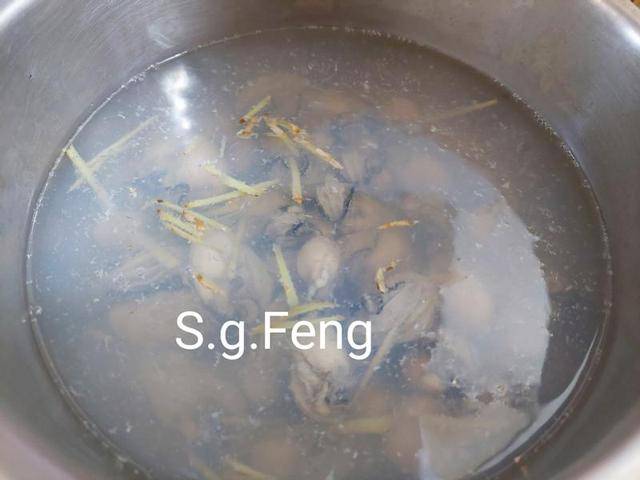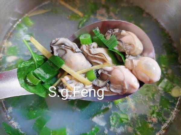 2、起鍋加入水、薑絲,開中火煮滾後改中小火。放入蚵仔,煮至水滾即可(因蚵仔易熟,煮久易縮水,影響口感,會太老)。再放入調味料與九層塔及青蔥,拌一下轉綠即可關火。