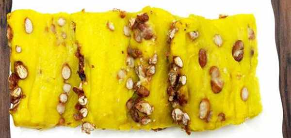 此糕呈方形,糕黃,棗紅,粘軟香甜。教您黃米切糕(山東)怎麼做,如何做黃米切糕(山東) 將紅棗洗凈,放入沸水鍋內煮至四成熟後撈出,倒掉水。鍋內另放涼水500克,燒沸,倒入棗。黃黏米面加水500克調成面糊,用勺把面糊慢慢地倒入鍋內,熟後倒入瓷盆內晾涼(或放冰箱內涼透)成糕,然後翻扣在一塊木板上,用薄片刀切塊裝盤。食用時可蘸白糖。