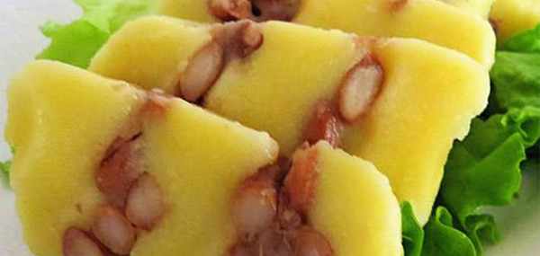 黃米磨成細粉,過濾後備用。紅小豆洗凈,入鍋煮至熟軟,撈出控凈水。黃米面與水 按1:1的比例調成稠漿糊,然後倒在鋪有濕佈的蒸籠上,攤成約3厘米厚,放入蒸鍋用旺火蒸至金黃色將熟時,開鍋,撒上一層紅小豆,約3厘米厚,攤平,緊接著再倒上一些黃米面稠糊,約3厘米厚,攤平,上籠再蒸,然後再撒上一層紅小豆和黃米糊再蒸,熟透即成,總厚度達10厘米以上,取出翻扣在案板上,現吃現切。