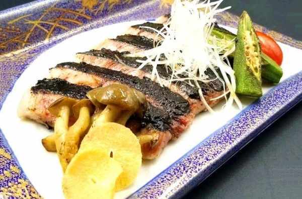 低溫處理好的牛肋肉拍上幹粉後掛上黑蒜糊,放入油鍋中略微過油定型,控油後改刀成條裝盤