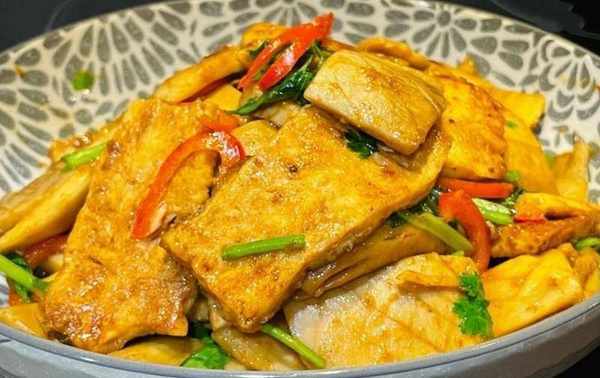 凈鍋後燒熱油,放入薑絲爆香,放入沙茶醬炒香,倒入杏鮑菇炒一會加入豆腐拌勻