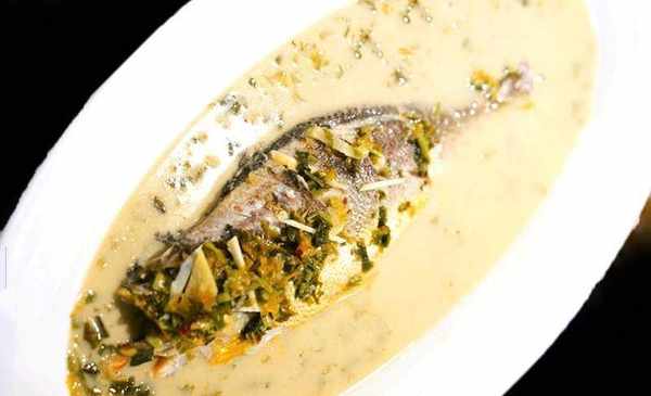 熱鍋冷油,滑鍋倒出,下入豬油,燒融化後放入黃魚煎香