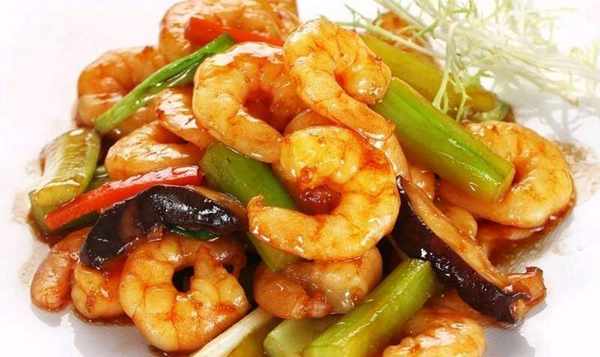蝦仁、西芹、鮮香菇、蔥段、薑片、燒汁