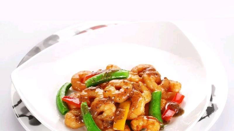 蝦仁、彩椒塊、甜蜜豆、黑椒汁