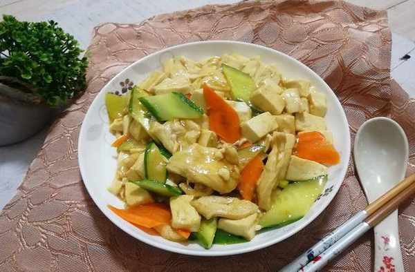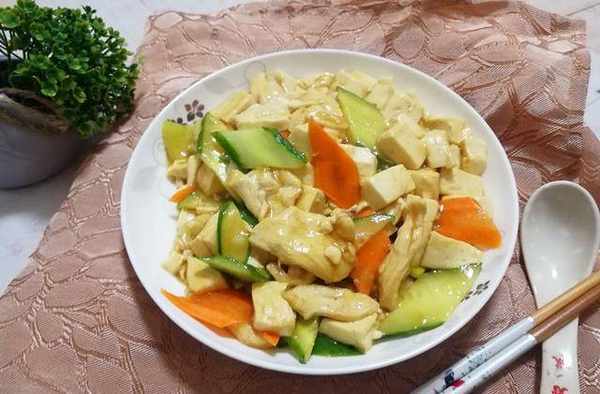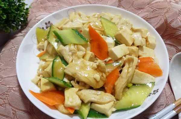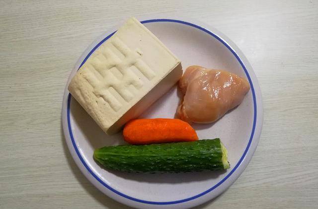 食材:雞胸脯肉150克、豆腐1塊、黃瓜1/2根、胡蘿卜1段、油鹽適量、香油1湯匙、蔥1段、薑2片、料酒1湯匙、醬油1湯匙、胡椒粉少許、淀粉適量