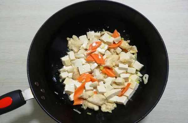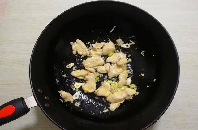 5.鍋加油燒熱,下入蔥花、薑末、蒜片爆香,下入雞肉片翻炒至變白,下入胡蘿卜片翻炒均勻